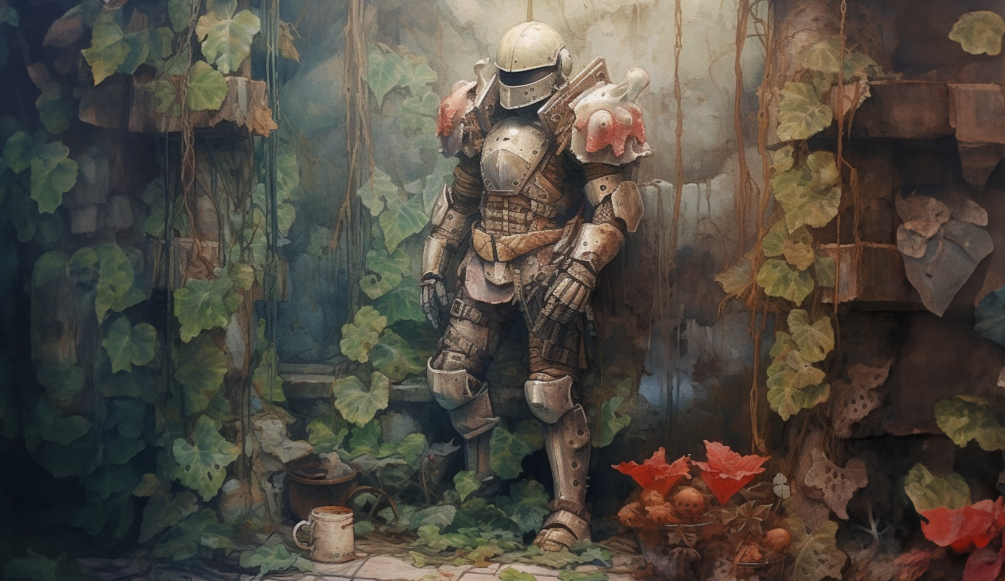 You may not notice Mulch when you first see them, what looks like a suit of armor in the corner of an abandoned castle is, in fact, a fungal organism residing in that ancient armor. The armor is shaped as though it still holds a human form within, but upon closer inspection, the visor of the helm peers out into the world with an inky blackness. The only striking thing, the armor's shoulder pads have been overtaken by an intricate overgrowth of fungi in an array of colors, sizes, and shapes, forming a vibrant tapestry that extends over the metal like a lush epaulet. The remaining sections of the suit remain unblemished by the fungal life, save for the occasional spore print or mycelium thread, presenting a stark contrast between the living and the long-abandoned.